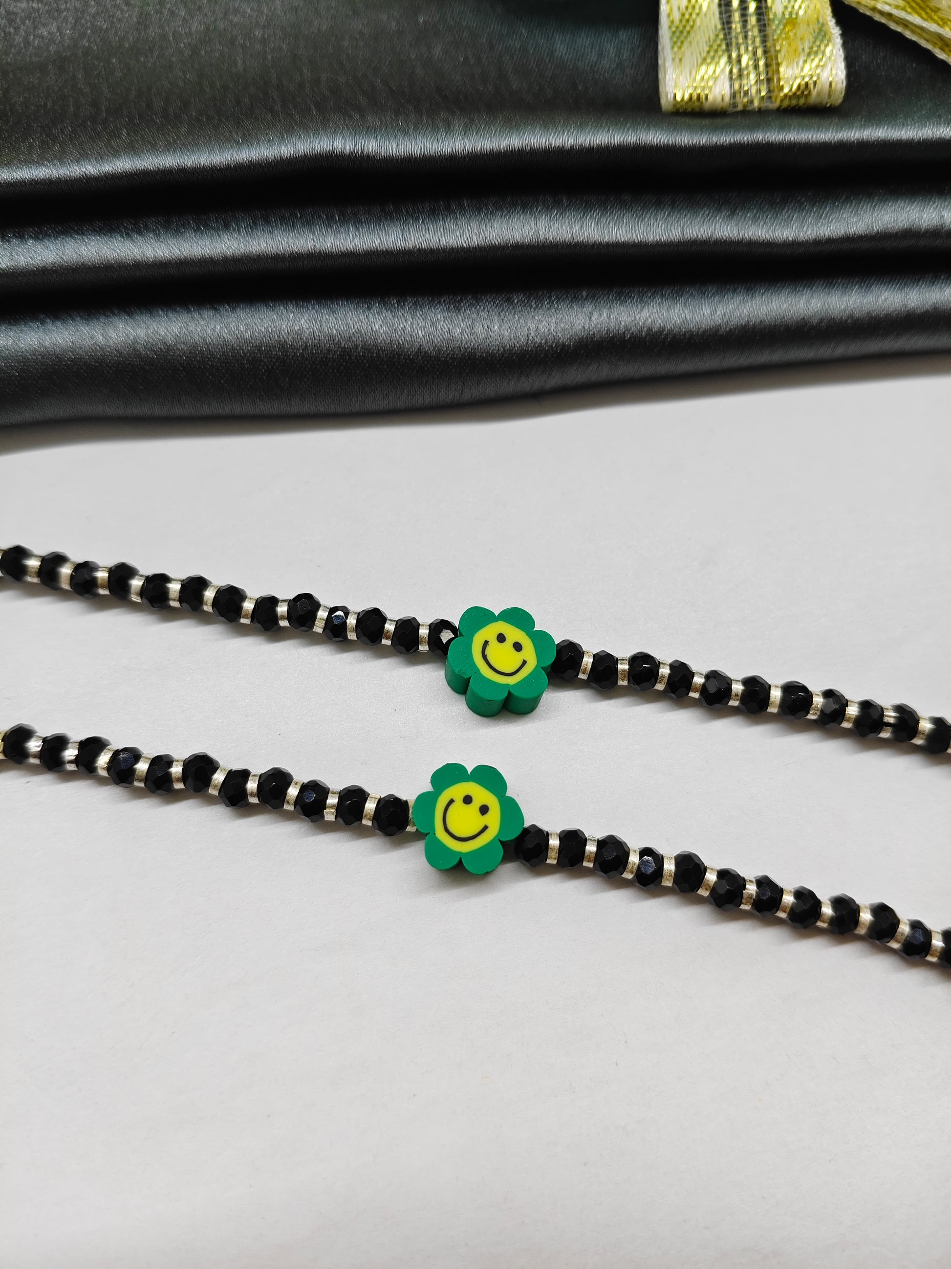 925 Silver Kids Nazariya Silver With Black Beads Rubber Green With Yellow Sunflower Design Anklet\Bracelet Pair