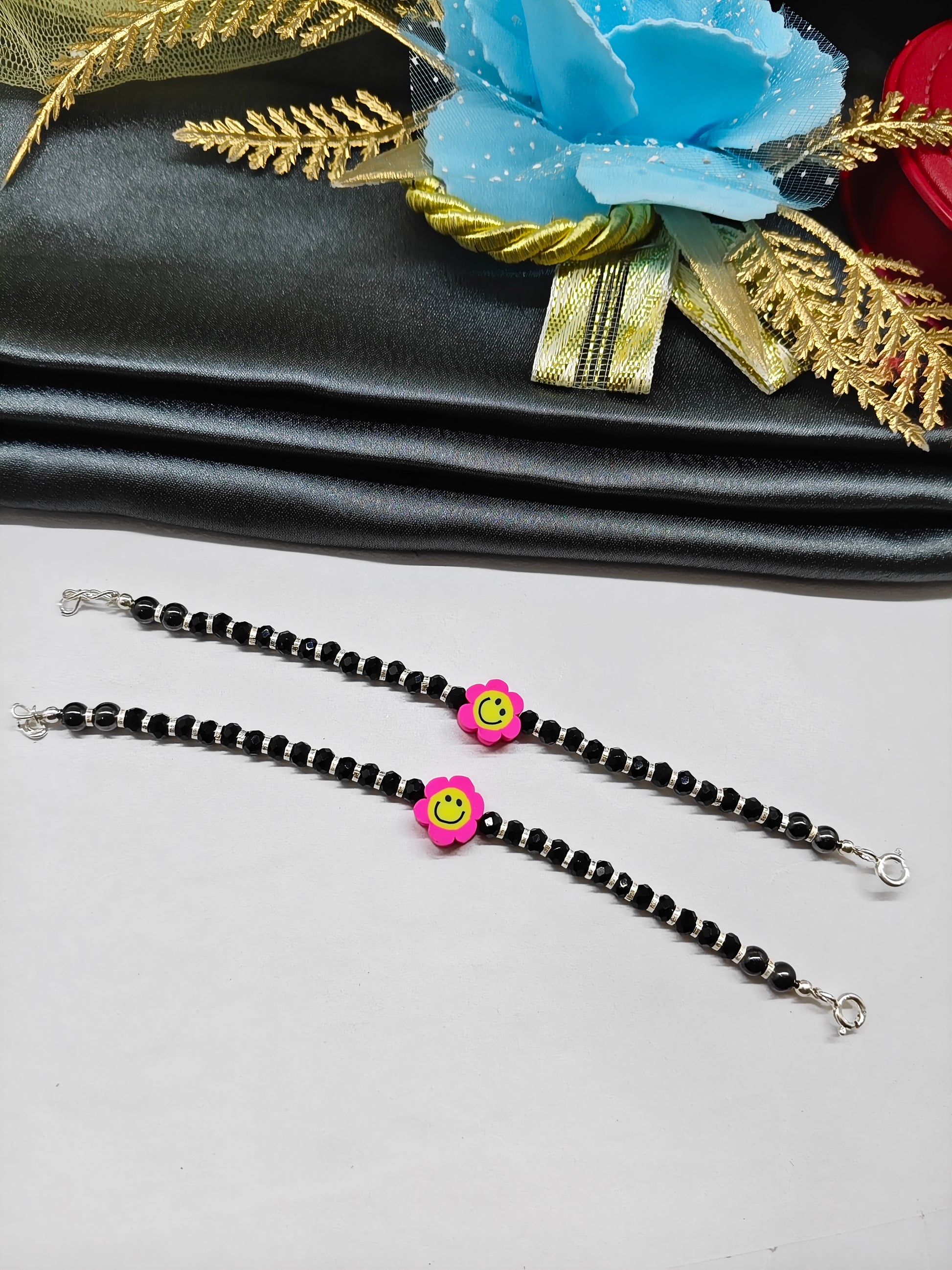 925 Silver Kids Nazariya Silver With Black Beads Rubber Pink With Yellow Sunflower Design Anklet\Bracelet Pair