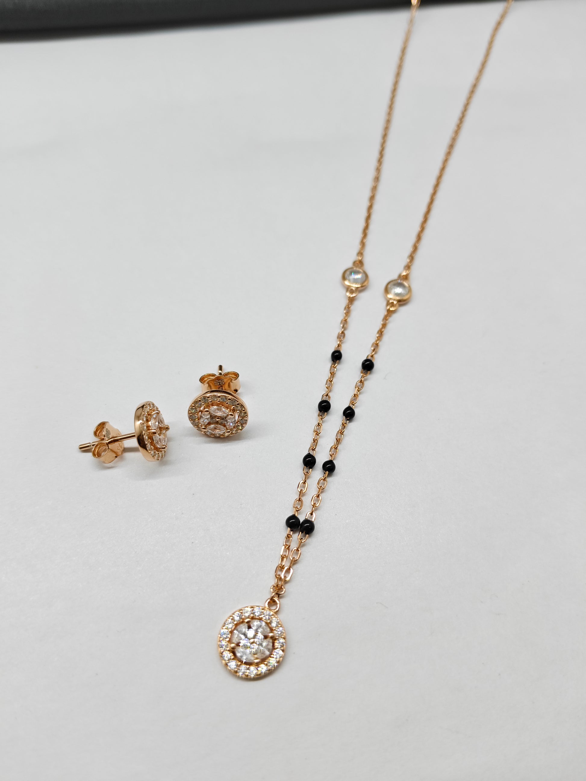 925 Silver Rose Gold Colour Mangalsutra Black Beads Round White Stone Necklace Set
