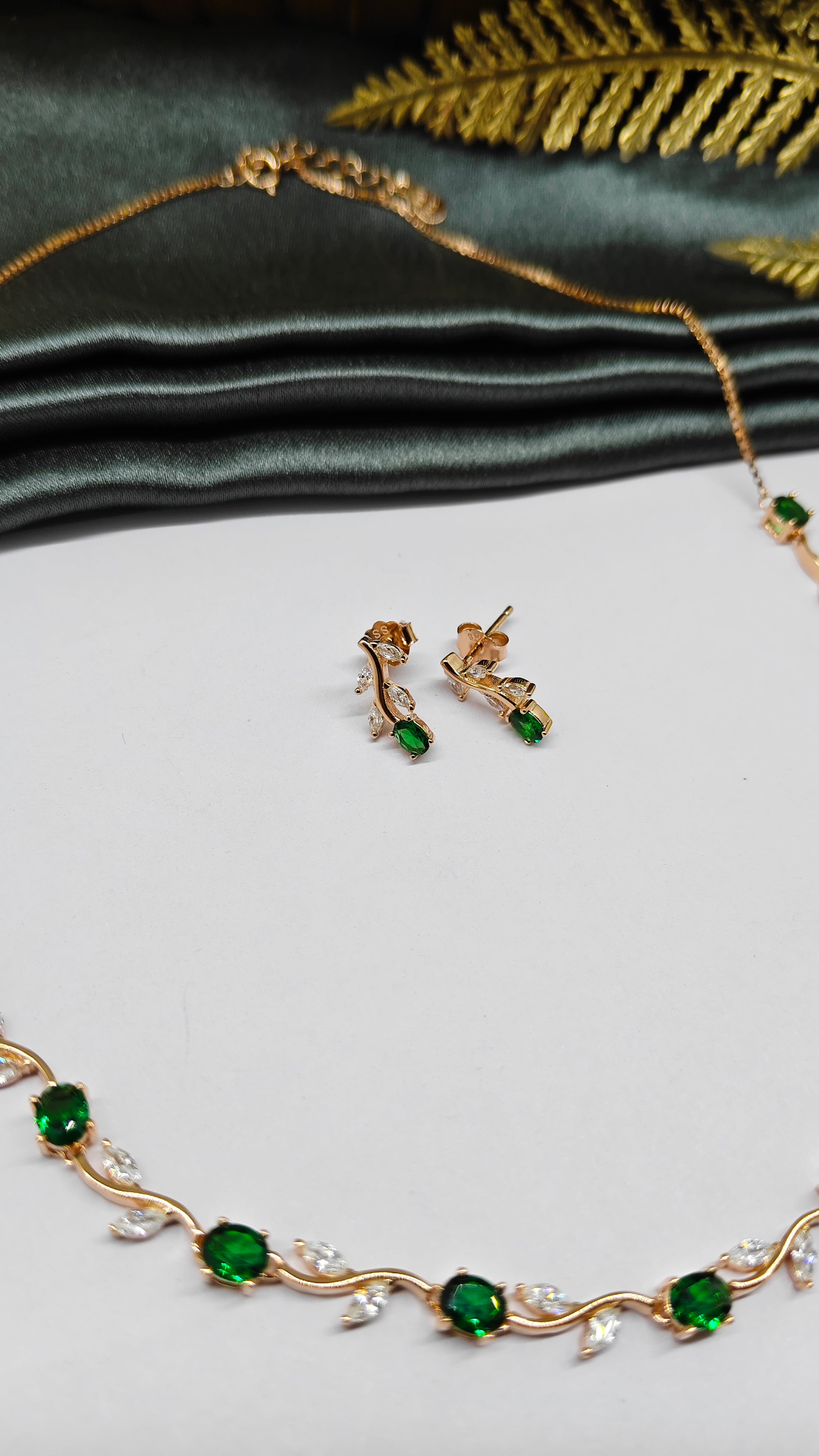 925 Silver Rose Gold Colour White And Green Stone Design Necklace Set